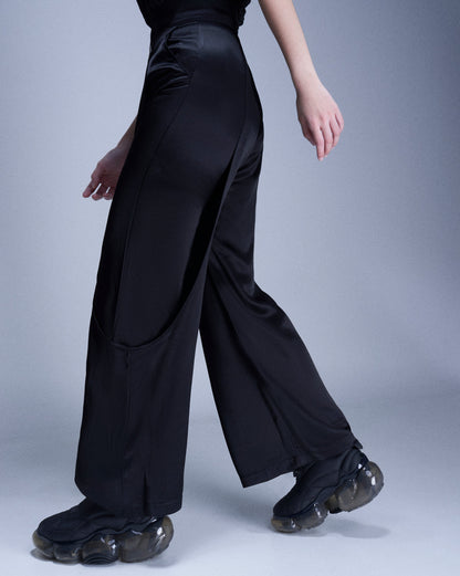 国産トリアセテートを75%配合した生地を使用し、肌にやさしく、2重仕立てでも通気性と快適な履き心地を両立したロングパンツです。光沢感があり、手触りは柔らかく滑らかです。